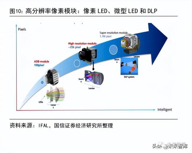 灯前大灯升级路线,基于光源角度,车灯从卤素-氙气-LED-激光光源升级;基于功能角度,车灯从传统照明到智能车灯(矩阵式LED/ADB/AFS/像素级DLP成像)升级,智能车灯可概括为更高分辨率的车灯,按照技术可分为LED阵列(矩阵式LED/ADB)、微像素LED(µAFS/mini/micro LED)、DLP,按照采用的设备可分为DMD(数字微镜设备)、LCD和LCOS(硅上液晶)。