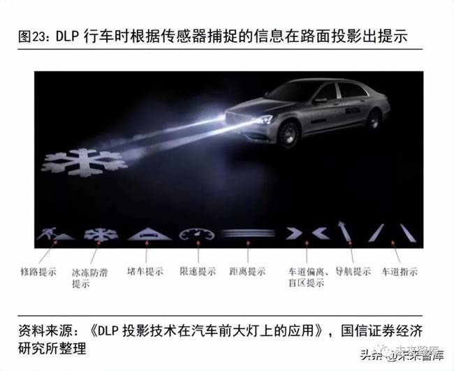 ❹可编程,智能交互:DLP技术能提供对车辆个性化的定制,比如灯光秀,可根据各种传感器捕捉的环境信息在路面投影出各种提示图案。目前,DLP大灯单价约1万元/只,按照国外的产品价格5000元以上,如果国内未来2-3年内投产,并且解决DLP光源技术的问题,价格有很大的下行空间。