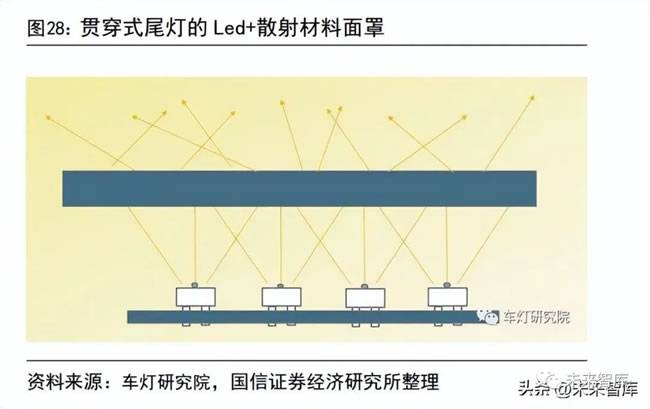 ②LED+散射材料面罩:该方案是国内很多灯厂贯穿式尾灯的方案,优势是设计简单,一根超长的LED灯板加上一块散射材料的面罩即可实现贯穿的效果,缺点是贯穿式尾灯的外观容易同质化,效果主要取决于面罩上的散射材料;