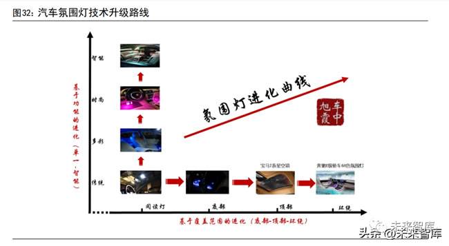 氛围灯升级路线,基于覆盖范围(顶部-底部-环绕)的升级;基于功能(传统-智能控制变色)的升级。各车企的选择路线来看,宝马全新X5全景天窗的玻璃上均匀分布着LED灯,可以组合成15000种图案;奔驰E级轿车已经可以提供64种颜色的氛围灯供车主选择。