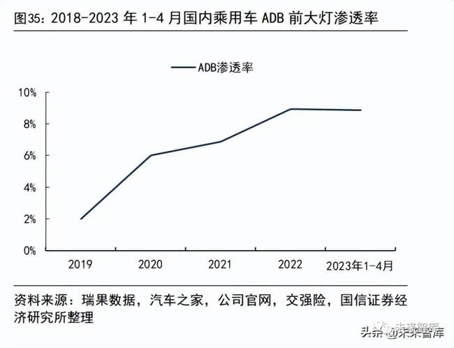 前大灯渗透率:2022年LED、ADB、DLP灯渗透率分别为78%、9%、低于1%,2023年1-4 月ADB灯渗透率为9%。