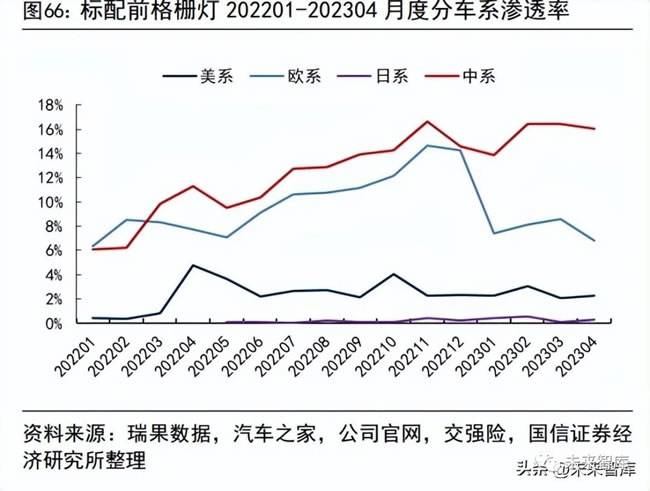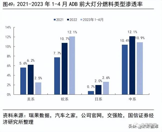 ★分车系:LED灯在美系、欧系渗透率超90%,ADB 灯在欧系、中系渗透率超 11%