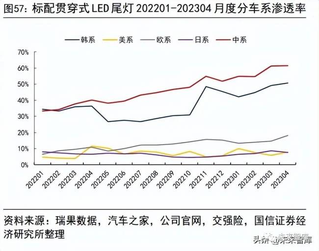 后尾灯渗透率:贯穿式尾灯2023年1-4月累计渗透率为35%,OLED尾灯2022年渗透率低于 1%。贯穿式LED尾灯:2023 年 1-4 月累计,贯穿式LED尾灯渗透率为35%。
