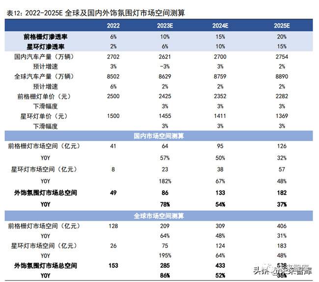 市场空间:全球车灯(含前大灯、后尾灯、外饰氛围灯)市场空间超3500 亿,国内市场空间超千亿。