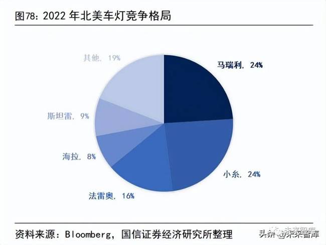 全球车灯竞争格局全球五大车灯龙头垄断超90%的市场份额,2011-2022年,日系小糸全球份额提升10pct。前五大车灯厂商占据了95%的全球市场,其他多数小散供应商分食5%的份额。2022年,前五大车灯厂分别是日本小糸(25%)、法国法雷奥(23%)、玛涅蒂马瑞利(20%)、德国海拉(16%)、日本斯坦雷(11%),其中日本小糸份额提升明显(2011年15%、21年25%),法雷奥的份额维持在21-23%左右,马瑞利的份额维持在17-20%之间,海拉维持在 16%左右,斯坦雷维持在10-11%左右,小糸主要挤压了其他小散供应商的份额。北美端,2013-2022年,日本小糸车灯市场份额提升6.5pct,德国海拉市场份额下滑5pct,玛涅蒂马瑞利市场份额下滑3ct。北美基本没有领先的本土车灯企业(原伟世通的车灯业务也于2013年被印度车灯企业Varroc收购),当前北美以日本(小糸)和欧洲(马瑞利、法雷奥)车灯企业为主,近年来在北美的日本车灯企业小糸在北美的市占率从2013年的17.5%提升至2022年的24%,主要挤压欧系车灯厂的份额,其中德国海拉车灯市场份额从2013年的13%下滑至2022年的8%,玛涅蒂马瑞利份额从2013年的27%下滑至2022 年的24%。