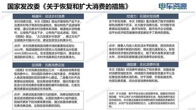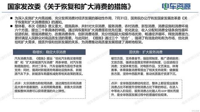 7月31日,国务院办公厅转发国家发改委《关于恢复和扩大消费的措施》的通知。《措施》提出要扩大新能源汽车消费,具体包括:①落实构建高质量充电基础设施体系、支持新能源汽车下乡、延续和优化新能源汽车车辆购置税减免等政策;②科学布局、适度超前建设充电基础设施体系,加快换电模式推广应用,有效满足居民出行充换电需求;③推动居住区内公共充电基础设施优化布局并执行居民电价,研究对充电基础设施用电执行峰谷分时电价政策,推动降低新能源汽车用电成本。
