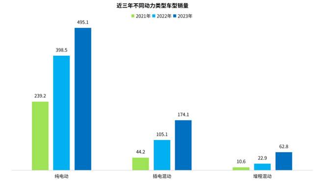 相较于2021年,2023年纯电动车销量增长了107%,插电混动车销量增长了294%,增程混动车销量增长了492%。