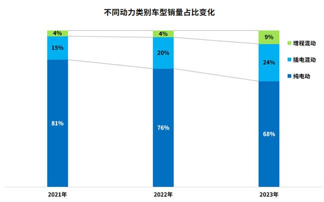 纯电动车的市场份额也从2021年的81%降至2023年的68%,插电混动车型则增长至24%,增程混动车型增长至9%。
