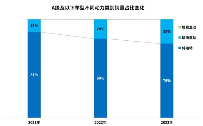 为了便于区分,可以把A级、A0级和A00级车型统称为小型车,这些车型2023年销量占比为60%,是新能源汽车市场的绝对主力车型。在该细分市场,2023年纯电动占比75%,插电混动占比25%,无增程混动车型。