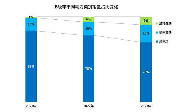 B级车2023年销量占比23%,是新能源汽车第二大细分市场,2023年纯电动占比70%,插电混动占比20%,增程混动占比9%。