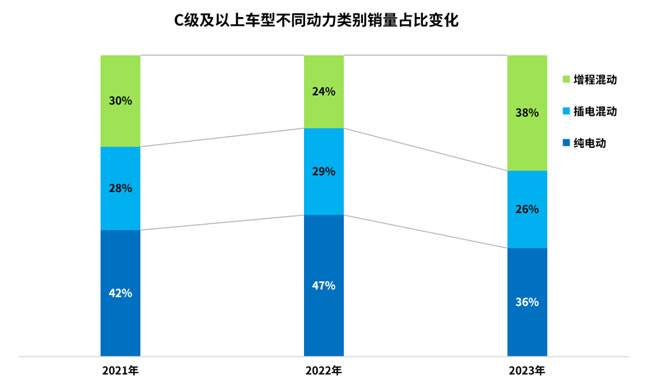 C级和D级属于大型车,2023年销量占比17%,在这个细分市场,纯电动车的优势不复存在,2023年纯电动车占比为36%,增程混动占比38%,插电混动占比26%。
