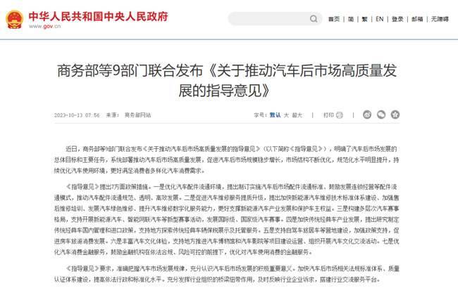 面对汽车保有量“井喷式”的增长,汽车后市场也实现了持续性快速增长,导致汽车维修市场增长空间势头强劲。对此,商务部等九部门联合发布《关于推动汽车后市场高质量发展的指导意见》(以下简称《意见》),《意见》明确提出,优化汽车配件流通环境、促进汽车维修服务提质升级、优化汽车消费金融服务等七方面政策措施。并指出,力争到2025年,汽车后市场规模稳步增长,市场结构不断优化,规范化水平明显提升,更好地满足消费者多样化汽车消费需求。