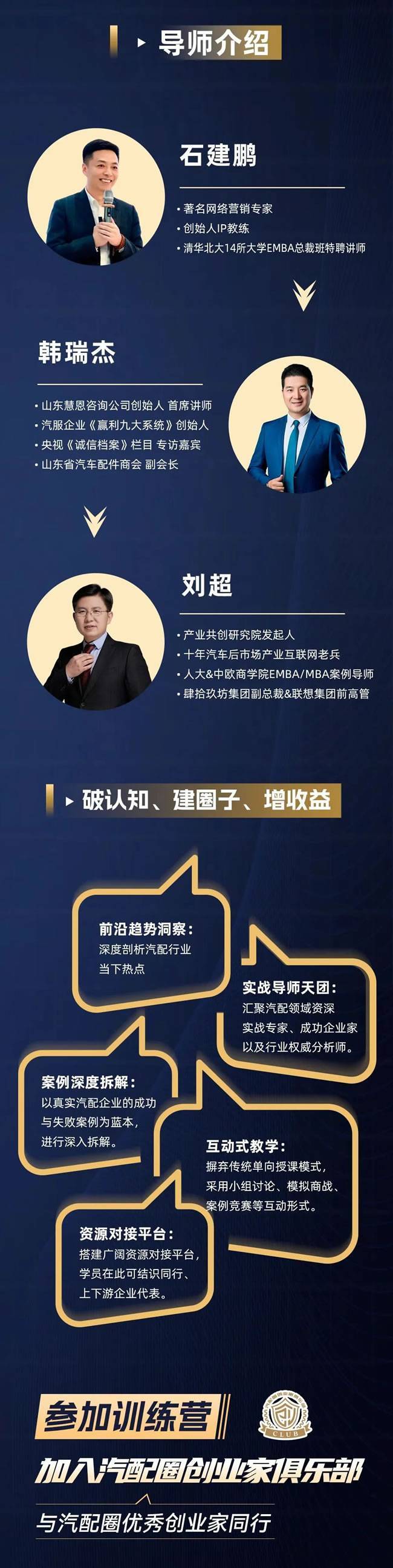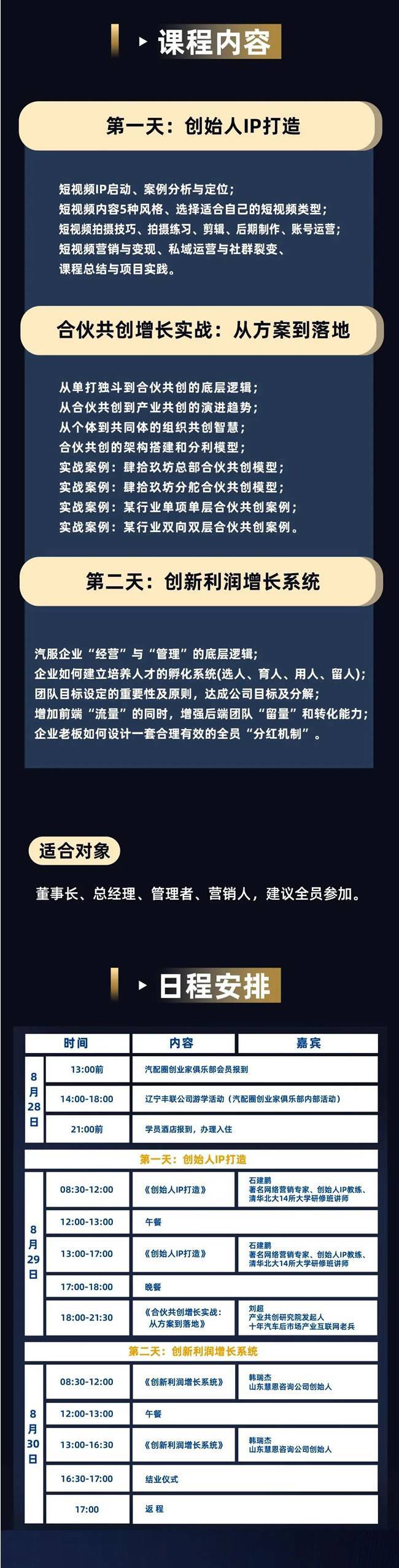 应北方汽配人的强烈呼声,第2期超级增长训练营即将于8月29-30 日登陆沈阳!三大导师再度联袂出击:石建鹏将带来升级后的IP拓客方法论,教你用东北区域流量密码打造创始人IP;刘超的合伙提效课程新增沈阳汽配城资源对接案例,让 "组队作战" 有现成模板可抄;韩瑞杰则针对北方市场特性,定制化拆解成本控制与团队激活方案——两天浓缩冠盛站实战精华,直击拓客难、效率低、利润薄三大痛点。