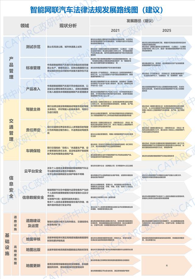 在此背景下,中国汽车技术研究中心有限公司中国汽车战略与政策研究中心作为汽车行业独立第三方智库,致力于推动行业发展,携手汽车、通信、互联网等领域重点企业成立工作组,就智能网联汽车发展面临的法律法规问题开展深入研究。经过全面梳理和重点剖析,工作组完成了智能网联汽车产品管理、交通管理、基础设施(含道路设施、高精度地图、通信设施)以及信息安全方面的法律法规问题点排查,围绕产业发展需要,兼顾政策建议的可实施性,分析提出智能网联汽车产业发展面临的重要法律问题点及发展路径建议,意在推动智能网联汽车法律法规环境优化,助力产业创新发展。现联合工作组成员发布“智能网联汽车法律法规发展路线图(建议)”,供大家研讨。