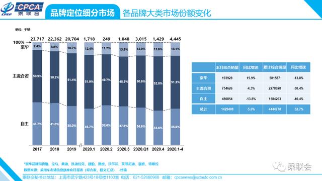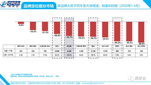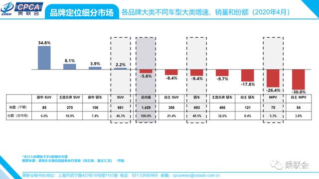 · 各品牌大类下不同车型大类增速、销量和份额——2020年4月及累计