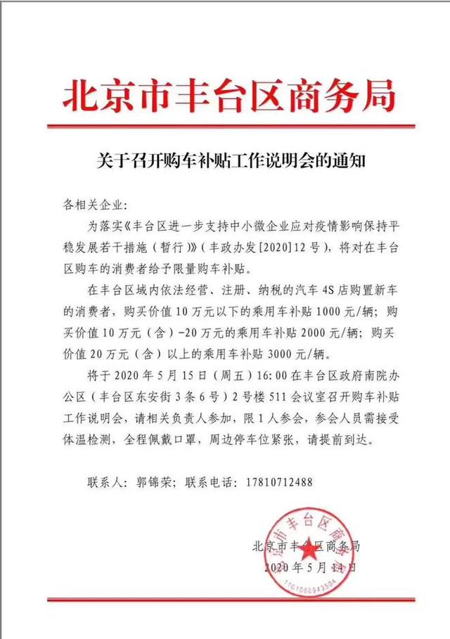 5月14日,北京市丰台区商务局发布《关于召开购车补贴工作说明会的通知》,通知称将对在丰台区购车的消费者给予限量购车补贴。