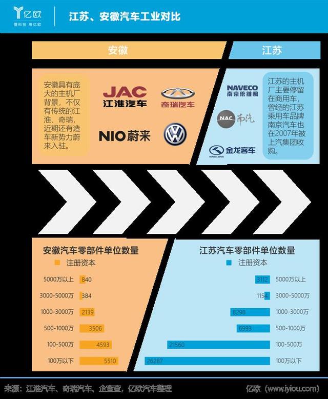安徽与江苏,谁在汽车业的布局最成功?这一问题的答案,“仁者见仁,智者见智”。在亿欧汽车看来,两大省份的倾向性明显不同,都根据各自不同的地方优势进行了差异化布局。二者形成合力,才最成功。
