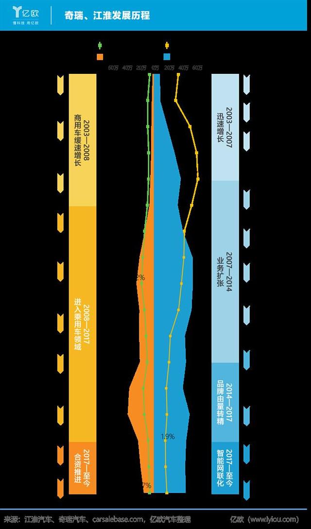 江淮很快意识到商用车存在天花板,遂于2005年至2006年间分别在意大利、日本成立了设计中心,2008年正式进入乘用车领域。短短1年后,江淮销量首次进入“10万俱乐部”,在2010-2014年间甚至达到了20万辆。但时代趋势浩浩荡荡。中国汽车市场整体下行趋势明显,江淮也未能引领新四化的潮流,其销量一路走低。