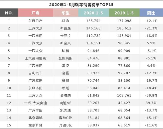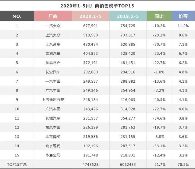 5月单月销量站上10万辆台阶的有5家企业,它们依次是:一汽大众、上汽大众、上汽通用、吉利汽车、东风日产。主流合资品牌与头部自主品牌企业推动整体市场走强,车市马太效应日趋明显。