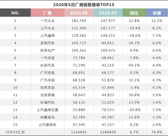 5月份TOP15厂商销售车辆合计1266042辆,单月销量集中度达78.8%,比同期增长3个百分点;累计销量集中度为78.5%,比同期增长4个百分点。
