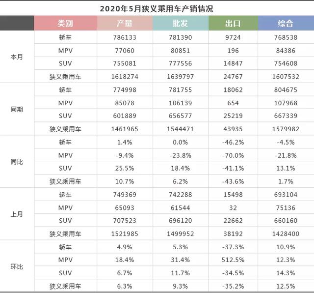 据乘用车市场信息联席会月报表终稿显示,5月份国内狭义乘用车市场销量达160.8万辆,同比增长1.7%,环比增长12.5%;1-5月累计销量605万辆,同比下降26.1%。