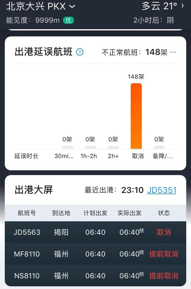 17日,航班取消量再度激增,两大机场累计超过800个航班。截至发稿,首都机场取消550个架次;大兴机场取消300个架次。