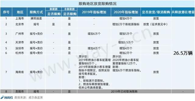截至目前,除北京市限购指标调控正在征求意见中,其余7个限购地区都已经确认2020年的增量指标。根据各限购地区的释放指标统计,预计2020年共释放26.5万辆燃油车潜在增量。