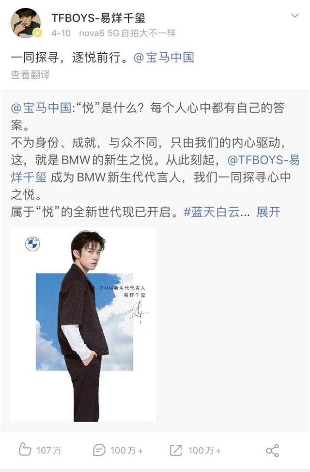 4月初宝马的一个新生代代言人易烊千玺将整个互联网炸开了锅,一封易烊千玺的信、一条官宣代言的微博都突破了100万以上的转发量,整体微博互动量达到千万以上。与流量艺人的合作,帮助宝马品牌突破了固有圈层,直接将目标受众进一步扩大下探到更多年轻的Z世代中。