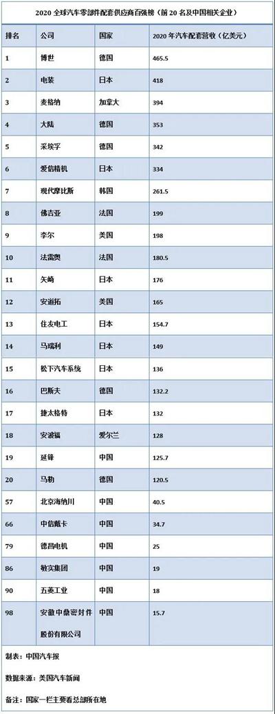 当地时间6月29日,2020全球汽车零部件配套供应商百强榜新鲜出炉。
