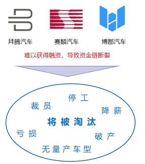 于造车成本过高,头部发展相对较好的车企融资输血,而末端车企由于资金断裂,直面破产。