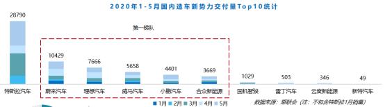 2020年1-5月国内造车新势力(含国产特斯拉)销量整体呈增长态势,同时,销量差距逐渐拉大,末端企业难有销量。