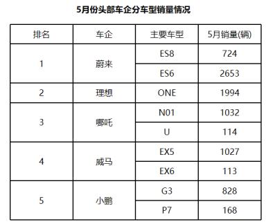 造车新势力中,5月仅有不到20家车企公布销量,其中头部车企多具备两款车型,且销量尚为可观,5月蔚来实销量为3377辆,其中,ES8、ES6实销量分别为724辆、2653辆。