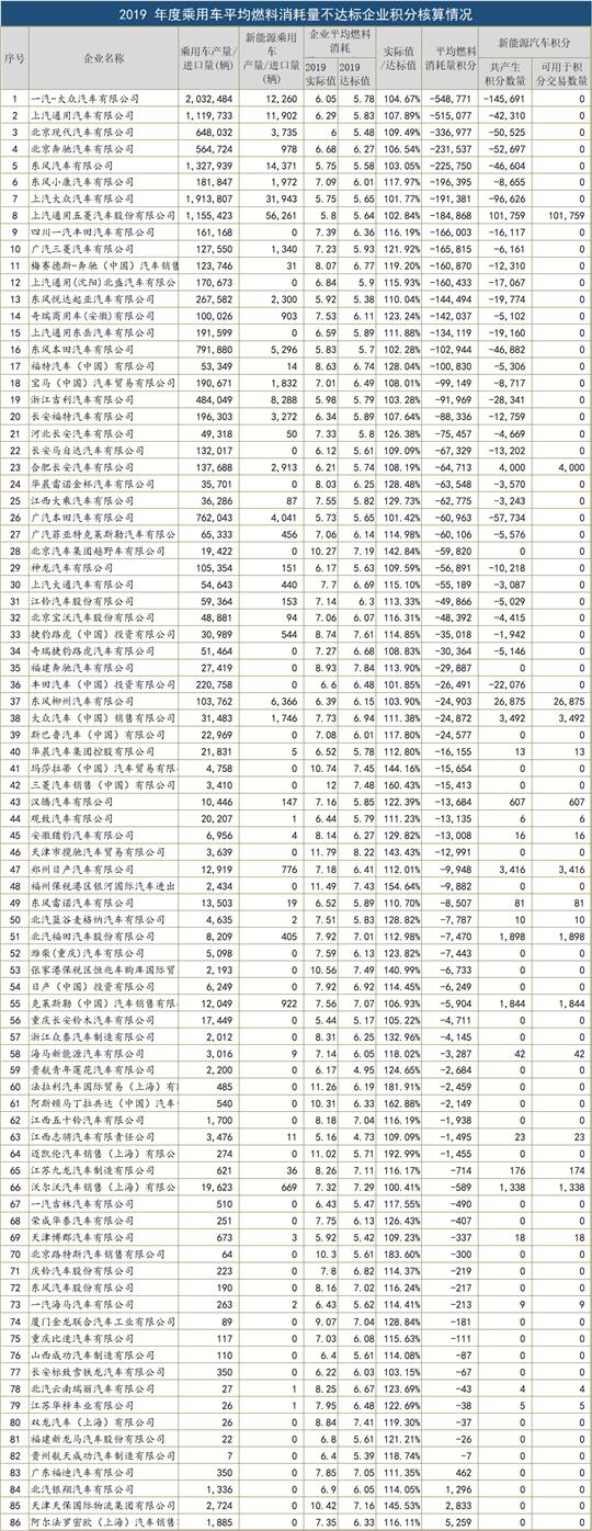 相对于2018年度的141家乘用车企,2019年度这个企业数量增加至144家,但是相反的是,“双积分”不达标的企业从2018年的75家增加至2019年的86家,约6成的车企“双积分”成绩不合格。