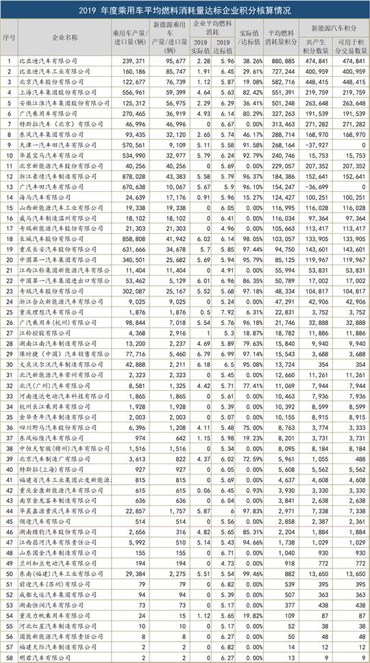 近日,工信部发布了2019年度中国乘用车企业平均燃料消耗量与新能源汽车积分“成绩单”,对144家车企“双积分”进行公示。统计显示,144家乘用车企业平均燃料消耗量实际值为5.56L/100公里,燃料消耗量正积分为643.43万分,燃料消耗量负积分为510.73万分,新能源汽车正积分417.33万分,新能源汽车负积分85.53万分。