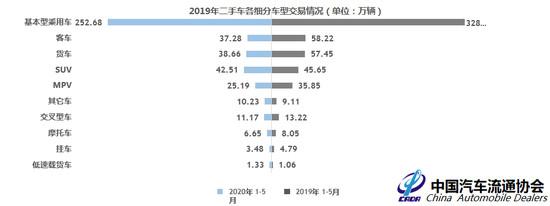 1-5月,除低速载货与其他车型略有增长外,其余车型较去年同期均有明显下降:全国二手车市场累计交易量为429.18万辆,同比下降23.60%。基本型乘用车共交易252.68万辆,同比下降23.04%,其中,SUV 42.51万辆,同比下降6.88%;MPV 25.19万辆,同比下降29.75%。商用车方面,交叉型乘用车11.17万辆,同比下降15.45%。客车37.28万辆,同比下降35.96%;载货车38.66万辆,同比下降32.70%。