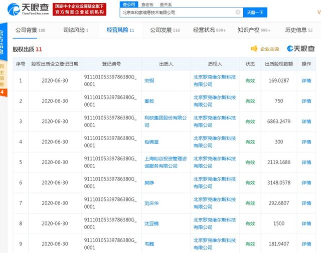 7月6日,记者在天眼查上发现,理想汽车的运营主体北京车和家信息技术有限公司(以下简称车和家)新增11条股权出质信息,11位股东全部出质股权,质权人为北京罗克维尔斯科技有限公司(以下简称罗克维尔斯)。