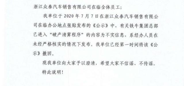 在“铁牛集团总部已确认进入破产清算程序”的公告发布一天之后,事情却出人意料的出现了反转。7月8日,杭州市临安区人力资源和社会保障局发布公告称,2020年7月7日在浙江众泰汽车销售有限公司在临办公地点张贴发布的《公示》中,有关铁牛集团总部(众泰汽车大股东)已进入“破产清算程序”的内容为不实消息,系经办人员在未经严格核实的情况下发布,已经第一时间将该《公示》撤回。