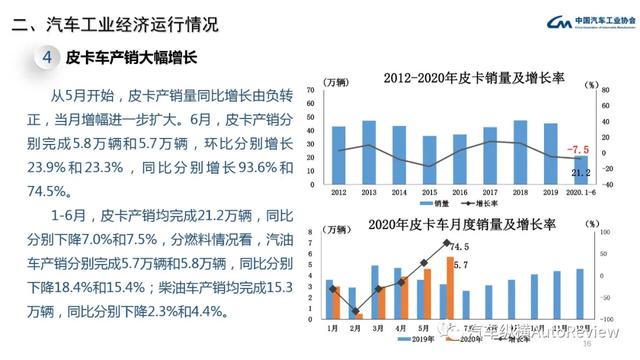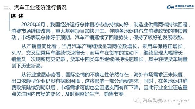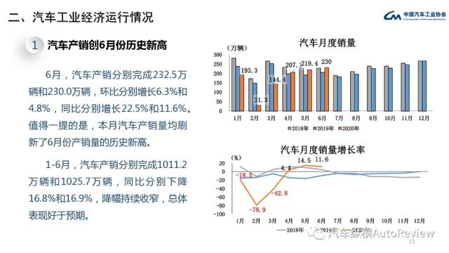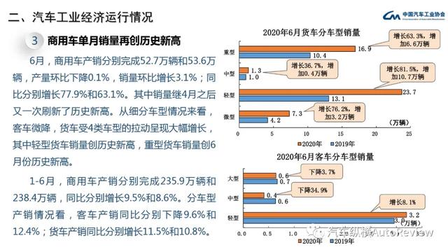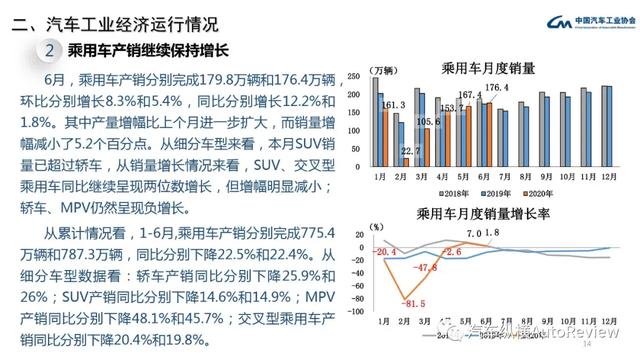 中汽协表示,2020年6月,我国经济运行总体复苏态势持续向好,制造业供需两端持续回暖,消费市场继续改善,重大基建项目加快开工。伴随各地促进汽车消费政策的持续带动,市场表现总体好于预期。汽车产销延续了回暖势头,保持了较好的发展态势。从产销量同比看,当月汽车产销继续呈现两位数增长。乘用车保持正增长,SUV、交叉型乘用车继续快速增长;商用车在货车的拉动下,继续呈现大幅增长,销量又一次刷新历史记录,货车中四类车型继续保持快速增长,其中轻型货车销量创下历史新高。