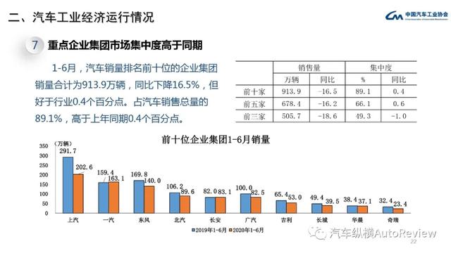 重点企业集团市场集中度高于同期。1-6月,汽车销量排名前十位的企业(集团)共销售913.9万辆,占汽车销售总量的89.1%。在汽车销量排名前十位企业中,一汽和长安销量结束前5月下降,呈小幅增长,华晨略有下降,其他企业降幅依然明显。
