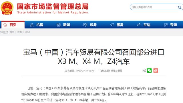 宝马(中国)汽车贸易有限公司自2020年7月24日起,召回2018年12月11日到2019年5月14日生产的进口宝马X3 M、X4 M、Z4车辆,共计356台。