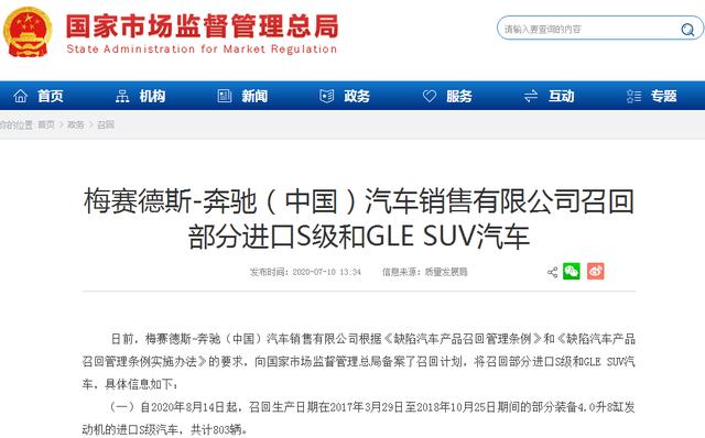 一是自2020年8月14日起,召回生产日期在2017年3月29日至2018年10月25日期间的部分装备4.0升8缸发动机的进口S级汽车,共计803辆。