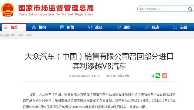 大众汽车(中国)销售有限公司决定自2020年8月17日起,召回2018年5月22日至2020年2月27日期间生产的部分2018-2020年款进口宾利添越V8系列汽车,共计1637辆。