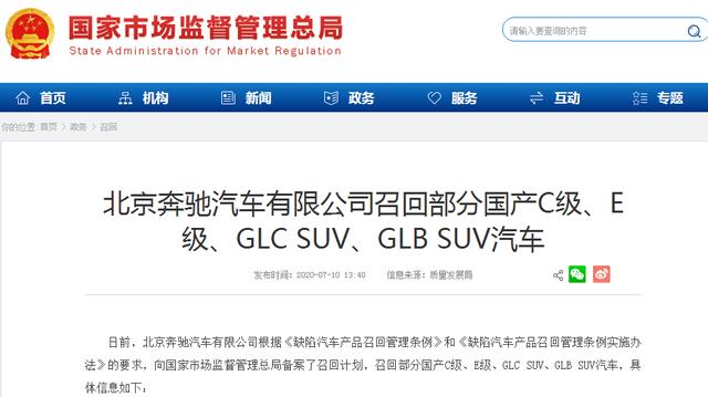 北京奔驰决定自2020年9月25日起,召回生产日期在2019年11月18日至2019年12月2日期间的部分国产C级、E级、GLC SUV汽车,共计3710辆。召回范围内的部分车辆由于供应商生产偏差,前排座椅高度调节器的材料可能不满足要求。当车辆发生碰撞时,外力作用可能导致管材出现断裂,座椅和乘员可能发生移动,从而增加碰撞时乘员受伤的风险,存在安全隐患。北京奔驰将通过梅赛德斯-奔驰授权服务中心,为召回范围内车辆检查受影响侧前排座椅高度调节器的制造编号,如果确认是受影响编号或读取不到编号时需更换座椅高度调节器,以消除安全隐患。