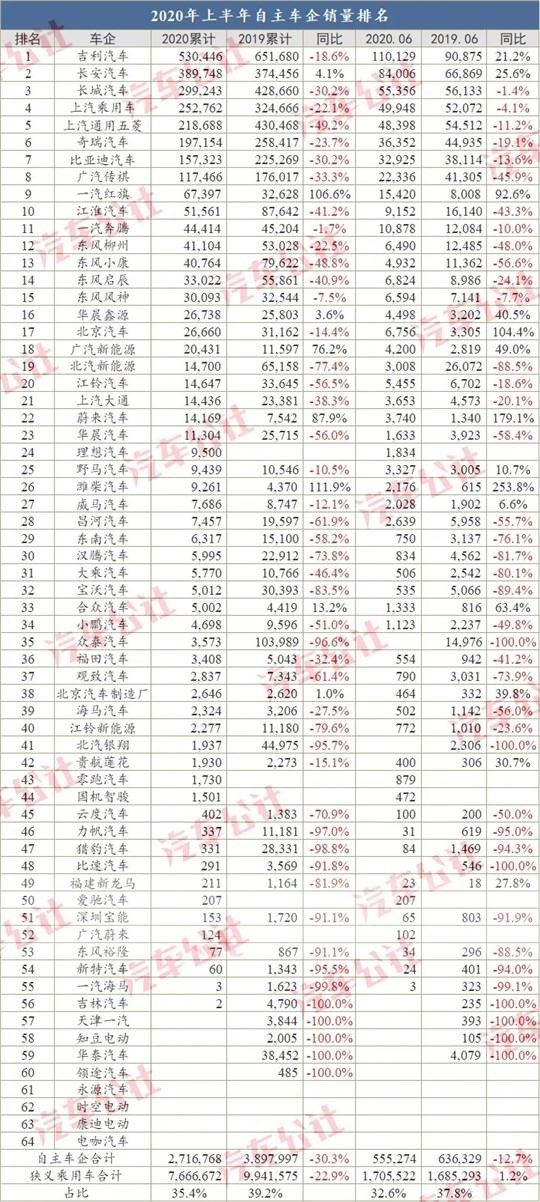 在那些表现糟糕的车企中,自主品牌应该是最为明显的。6月份自主品牌的份额再创历史新低,达到32.6%,今年上半年自主的份额也从去年同期的39%下滑至35.4%。要知道放在四五年前,自主的份额是达到了40%以上,掉下来8%的份额放在中国2000多万辆的大蛋糕中,也有近200万辆的总量,这意味着自主品牌这些年活生生地跌掉了一个200万辆的冠军企业。
