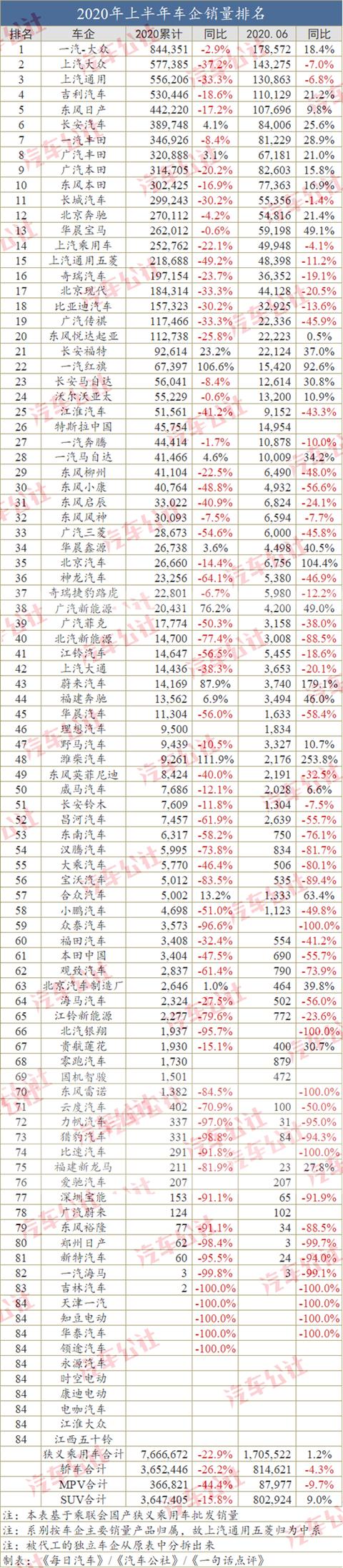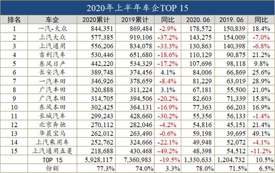 上半年的数据因为疫情因素,自然是下跌的多,毕竟市场大盘都在两成的跌幅。但是15强车企的表现也有强弱,上汽四家车企上汽通用五菱(-49.2%)、上汽大众(-37.2%)、上汽通用(-33.3%)、上汽乘用车(-22.1%)和长城汽车(-30.2%)依然领跌。