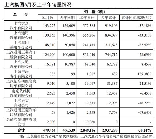 从6月份的数据来看,上汽旗下4家企业上汽通用五菱(-11.2%)、上汽大众(-7%)、上汽通用(-6.8%)、上汽乘用车(-4.1%)领跌,成为前15强车企中,唯一5家下滑车企中的4家。另外一家是长城汽车,6月下跌了-1.4%。