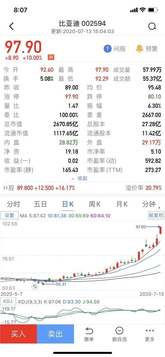 截止到7月13日收盘,比亚迪(0002594.SZ)股价为97.9元每股,总市值达到了2670.85亿元,一举超过了上汽集团(600104.SH)2247.90亿元的总市值,成为A股市场中估值最高的汽车企业。