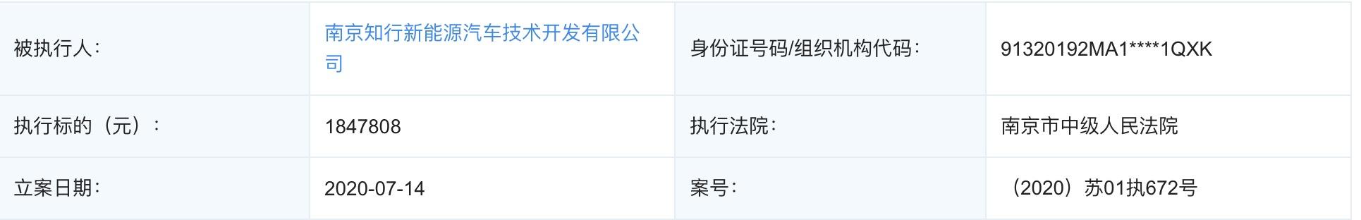 从企查查获悉,7月14日拜腾汽车运营主体南京知行新能源汽车技术开发有限公司新增被执行人信息,执行标的为1847808元,执行法院为南京市中级人民法院,案号为(2020)苏01执672号。