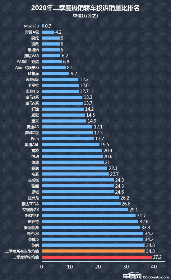 作为国内领先的缺陷汽车产品信息和车主质量投诉信息收集平台,车质网采用“投诉销量比”评价体系,对2020年二季度国内轿车产品进行分析。除进口车型外,二季度有销量数据支撑的轿车共有215款,其销量之和为233.4万辆。为确保数据的准确性,车质网本次只统计这215款车型的首次投诉案例,最终计算得出二季度国内轿车投诉销量比均值为万分之37.2。