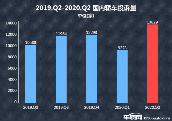 如上图所示,近一年来轿车投诉量变化趋势与销量相同,呈现出触底反弹的走势。二季度轿车投诉量高达13,829宗,环比上涨49.9%,创造了车质网成立十年来轿车季度投诉量的新纪录。